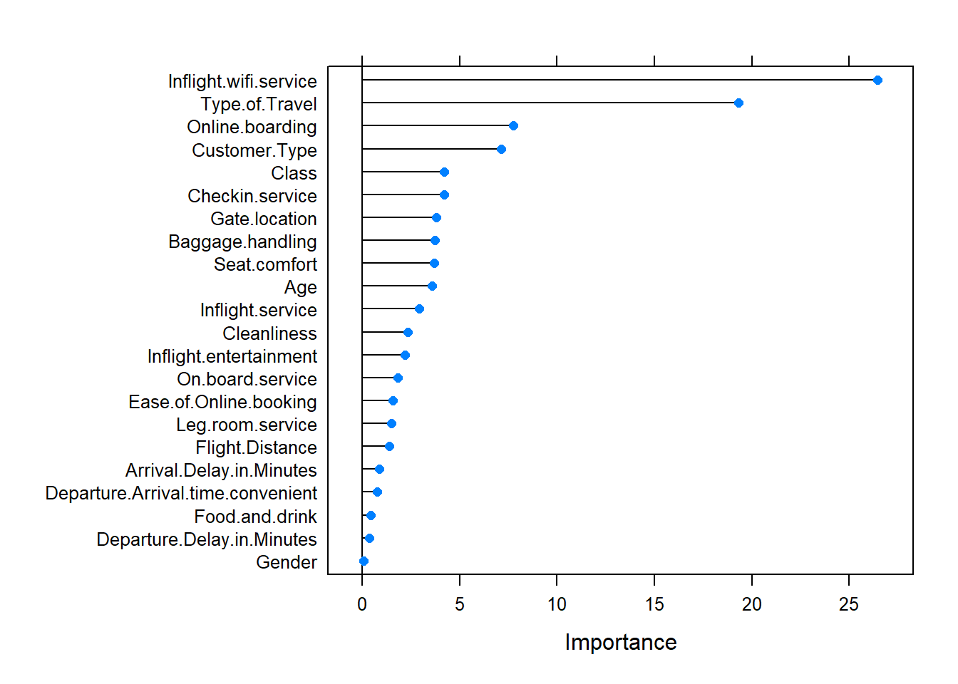 From the variable importance plot, wifi service has really high importance, and then type of travel and online-boarding.